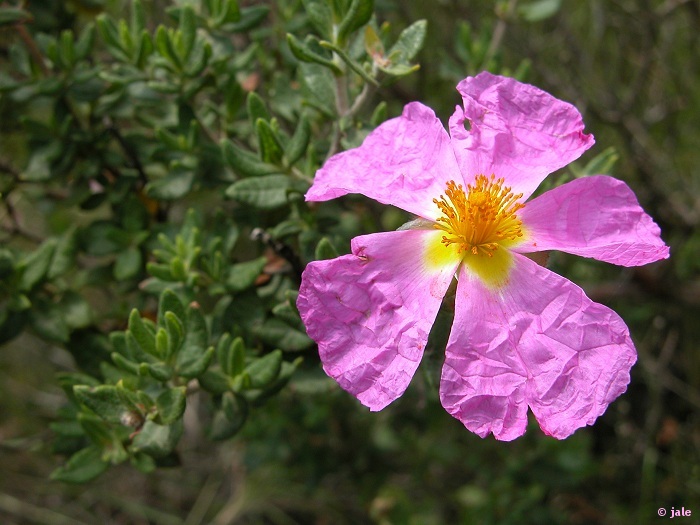 Arbusto de hasta 80-90 cm de altura, muy ramificado, sus ramas tienen pelos densos, estrellados, simples, glandulíferos. Las hojas superiores son sésiles y las inferiores pecioladas, generalmente elíptico-lanceoladas, tomentosas, con los márgenes ligeramente revolutos. Los pétalos, de hasta 25 mm de longitud, suelen ser de color rosado, con una mancha basal de color amarillo. El fruto en cápsula, de hasta 9 mm de longitud, tiene forma globosa; y sus semillas son tetraédricas, papilosas y de color parduzco.