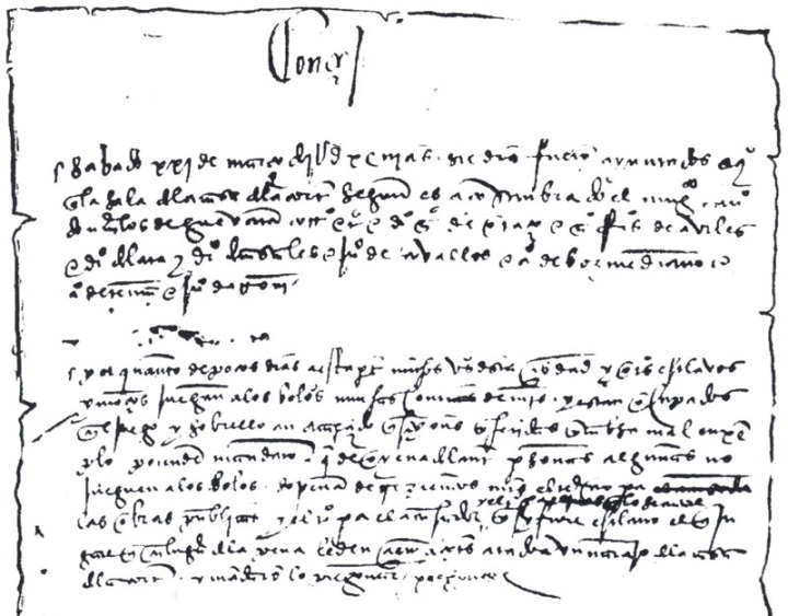 "Por cuanto de pocos días a esta parte muchos vezinos desta çibdad y otros esclavos y moços juegan a los bolos muchas contias de maravedis y están ocupados en el juego, y sobrello an acaeçido questyones y heridas y cabsa mal exemplo, por ende mandaron que de oy en adelante personas algunas no jueguen a los bolos, so pena de tresientos maravedis, el terçio para las obras públicas, y el terçio para el acusador y el terçio para el juez que lo secutare. Y si fuere esclavo el que jugare, que en lugar de la pena le den çien açotes atado a vn naranjo de la casa de la Corte, y mandáronlo pregonar. Pregónese".