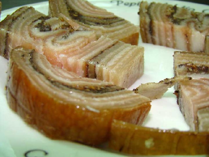 Para fabricar este peculiar bocado, se corta en tiras la piel del animal para ir montando con ellas vasrias capas que se irán intercalando con sobrante del embuchado y se condimentará con especias en abundancia, como canela, oréganos, pimienta negra y clavo.