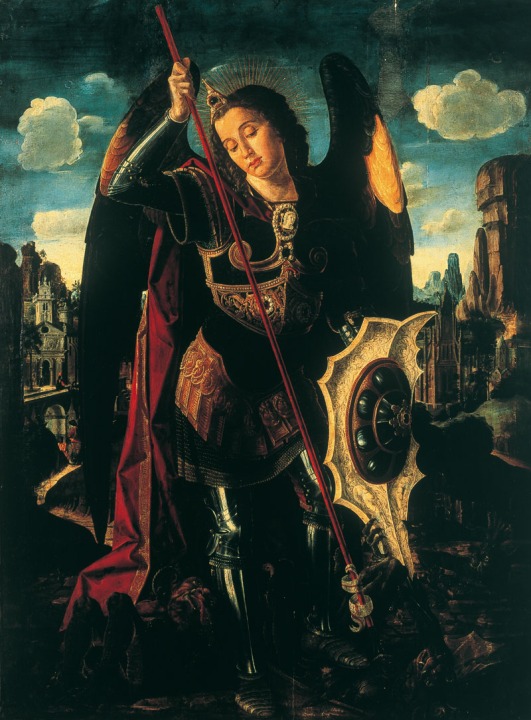 A través de la mirada de la historia del arte esta obra ha sido estimada como síntesis de influencias diversas –italianas y flamencas– que la sitúan en los umbrales del renacimiento levantino y la convierten en una de sus obras capitales. Pero por encima de las consideraciones críticas ya expuestas en el catálogo, San Miguel no puede sustraerse a esos juegos retóricos tan útiles en la pintura cristiana, simbolizando no un episodio más de los narrados en el Génesis sino la representación de la gran epopeya universal, una verdadera gigantomaquia cristiana en la que fue puesto a prueba el poder de Dios, salvado por la acción del arcángel. La gran contienda entre el bien y el mal, entre el orden racional y el caos, de la que Miguel emerge victorioso, cobra aún mayor relieve al ser presentado con un atuendo militar en el que se funden lo heroico y lo fantástico, pues algo de héroe mitológico hay en esta figura pintada como si se tratara de un nuevo Perseo enviado para destruir a la Gorgona. Sus fantásticas armas –armadura pavonada, escudo de quebrados perfiles, camafeos protectores y afilada lanza– fueron forjadas también en un taller divino.