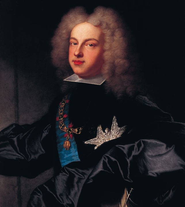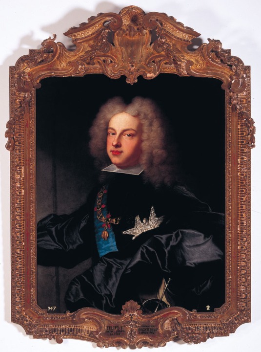 Próximo a partir para España, Felipe de Anjou hizo saber a su abuelo el deseo de llevar consigo un retrato que le acompañara en su nueva vida española, llena de incógnitas y recelos. A Jacinto Rigaud, el retratista oficial de la corte de Versalles, se le encargó la pintura –hoy en el Museo del Louvre– que habría de acompañarle, trazando aquél un exaltado panegírico de los ideales del absolutismo monárquico. El rey, en pie, quedaba a medio camino entre la veneración debida a su poder absoluto y la admiración sentida por conservar ciertas prerrogativas propias de los gobernantes de la Antigüedad. Los signos de su poder efectivo eran el manto de armiño, el trono, el cetro y la corona, elementos que sirvieron al pintor para condensar no sólo las ideas políticas que Francia representaba sino las condiciones imprescindibles que habían definido el retrato de ostentación y aparato.