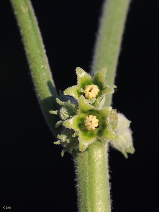 Arbusto muy ramoso, de hasta 2 m, que puede ser dioico y presentar pies masculinos y femeninos, con tallos sinuosos y torcidos, suberificados (de cubierta exterior engrosada y con tacto que recuerda al corcho), grisáceos o blanquecinos, verdes y pilosos cuando jóvenes. Hojas pecioladas, de limbo redondeado, a veces algo acorazonadas, cubiertas de fina pilosidad pubescente, más densa en sus primeros estadios de desarrollo, de habitualmente 3-5 cm de longitud o diámetro, que pueden tener coloración verde intensa (en épocas favorables) o verde amarillenta (en condiciones desfavorables). Flores solitarias, péndulas, por la escasa rigidez del peciolo, en ocasiones agrupadas en fascículos de 2-3, de aspecto campanulado, con cáliz de piezas soldadas triangulares, progresivamente filiformes, y pétalos de amarillo pálido. Fruto de tipo baya, subesférica, rodeada por el cáliz persistente, primero verde, después anaranjada o rojiza y –finalmente–negra.