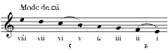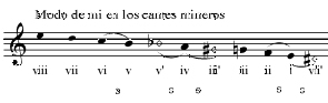 Pero además, en los cantes mineros y en otros palos como el fandango de Lucena, ciertos sonidos de la escala, particularmente el V grado, son móviles, esto es, que en función del contexto se cantan un poquito más arriba o un poquito más abajo. Y es precisamente este hecho el que confiere un sabor inconfundible a los cantes mineros y es a lo que tal vez, aunque hay mucha confusión al respecto, se refieren los aficionados cuando hablan de los famosos medios tonos (llamados “semitonos” en la jerga musical y señalados con “s” en los ejemplos) que tantas dificultades suponen para el cantaor no familiarizado con ellos. Para distinguir este particular uso del modo de mi podríamos referirnos a él como modo minero de mi o, simplemente, escala minera.