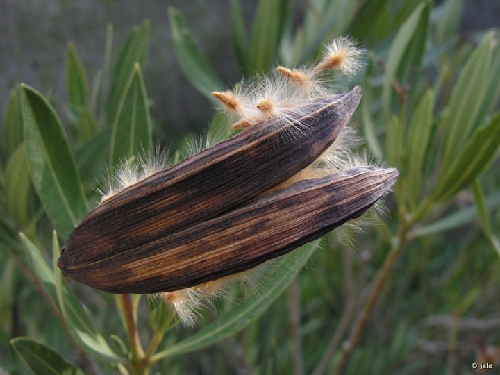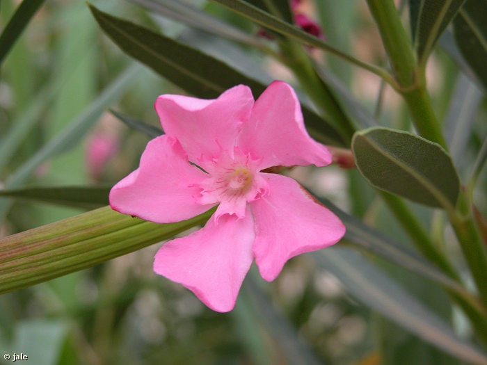 Arbusto perenne, alto, hasta 3-4 m de altura. Tallos rectos, erguidos, grisáceos. Hojas linear-lanceoladas, de 6-12 cm, de color verde oscuro, nervio central más claro, muy marcado en el envés. Flores de 4-6 cm de diámetro, rosadas, cinco piezas, soldadas en su base a modo de tubo, con 'coronula' que cierra la garganta, agrupadas en corimbos terminales. El fruto es un folículo alargado, de 8-15 x 1-2 cm, que se abre por una línea de dehiscencia longitudinal. Las semillas presentan un penacho de pelos apicales para su dispersión por el viento.