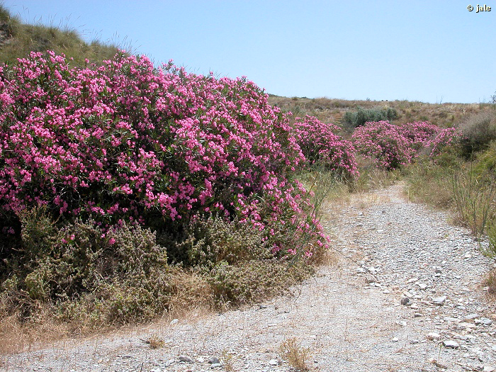 Lechos de ramblas, arroyos y ríos en cotas medias y bajas de zonas cálidas. Los baladrales, formaciones definidas por esta especie, quedan recogidas en el hábitat de la Directiva 92/43/CE: Galerías y matorrales ribereños termomediterráneos (Nerio-Tamaricetea y Securinegion tinctoriae, código Directiva Hábitat 92D0) y corresponden a la asociación fitosociológica Rubo ulmifolii-Nerietum oleandri (código asociación Directiva Hábitat 82D033). Son formaciones particularmente características de ramblas no salinas, por donde no existe una circulación permanente de agua, salvo en épocas de lluvia. Florece a finales de primavera, en verano y comienzos del otoño. Los frutos empiezan a aparecer en verano, se abren a finales y en otoño.