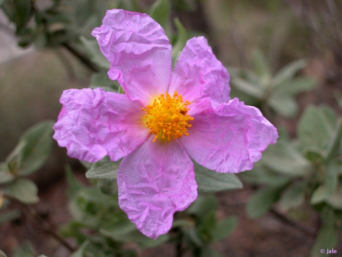 La jara da una preciosa flor de unos 5 o 6 cm de diámetro, con cinco pétalos arrugados (parecen de papel), de un precioso color rosáceo-púrpura, y numeros estambres amarillentos. La flor crece en los terminales de los tallos de la planta, floreciendo entre los meses de marzo y junio.
