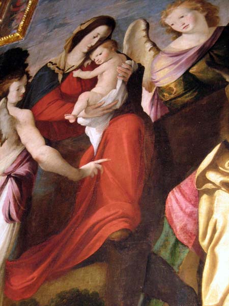 Destaca en este sentido la figura del ángel de la derecha, muy estilizado y de proporciones menos voluminosas. En cuanto al color también difiere del resto de la composición y el tamaño es menor que el del resto de las figuras. Por otro lado, las figuras de María, el Niño, el otro ángel y José, están de cara al espectador, mientras que este otro tiene una postura opuesta que denota una integración forzada.