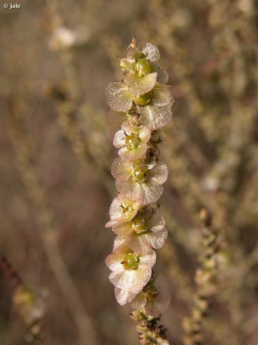 Pequeño arbusto de hasta 1 m, con raíces principales gruesas y profundas, que se continúan en una enmarañada red de pequeñas raicillas sucesivamente muy ramificadas y divididas, de color blanco-amarillento. Tallos delgados, estriados, pardos o prácticamente negros, intrincados, los jóvenes verdes, desarrollándose en el extremo de los anteriores, con hojas, lineares, cortas, de 0,5-1 cm de longitud. Inflorescencia espiciforme, de flores en densos y largos grupos al final de las ramillas. Flor poco vistosa, hermafrodita, de simetría pentámera, en la que no se diferencia cáliz ni corola, sólo cinco piezas (tépalos), entre los que se encuentran los cinco estambres, el órgano más desarrollado y claramente reconocible. Durante la formación de los frutos, los tépalos continúan creciendo, y se desarrolla un ala subcircular membranosa de color llamativo, en la gama del rosado-purpúreo, de intensidad variable y en ocasiones hasta blanquecino-verdosa.