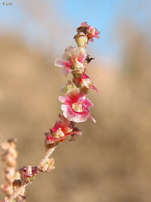 Arbusto monoico, perenne y alto, de hasta 3 m de altura. Tallos muy ramificados y enmarañados, lisos, algo agrietados, cenicientos o grisáceos. Follaje denso, con hojas de distribución alterna, ovado-lanceoladas, subrómbicas, de borde entero y algo onduladas, verde glaucas a grisáceo-blanquecinas, con nervios principales marcados en el envés, hasta 4 cm de longitud. Flores muy poco vistosas, de simetría pentámera, unisexuales, agrupadas en densos racimos con forma de espiga, de tonalidad predominante amarillenta. Frutos monospermos, de tipo aquenio, provistos de un ala membranosa blanquecina-rosada.